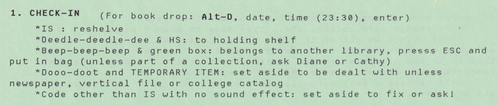 “Way back when, as a public library inaugurated their first automated circulation system and Hilary Caws-Elwitt was responsible for training her co-workers, she wrote up some beautifully onomatopoetic instructions! Note that “no sound effect” is the exceptional case. Bonus points for any library-IT-history nerds who can identify the specific software merely from the sound effects described. I’m assuming it’s Brodart, but we’re gonna need a version number before any prizes are awarded. (Caveat: I don’t know the answer, though HC-E might. Or perhaps these specific sound effects were important Brodart trademarks that carried over from each version to the next?)”