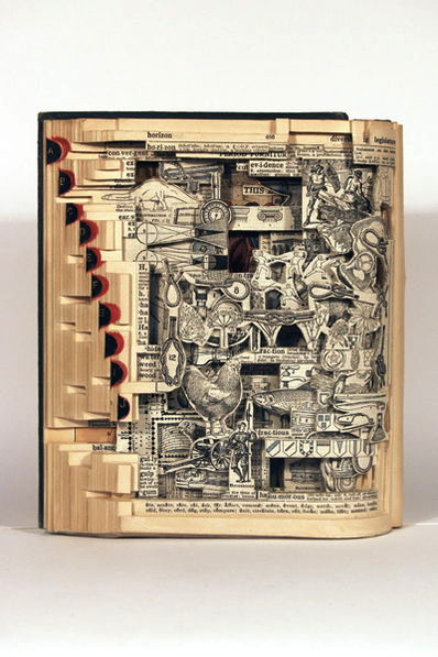 Many artists’ books are playful and shenaniganish, but there are a couple who seem particularly worthy of mention on Library Shenanigans. One is Brian Dettmer, whose “book autopsies” might be considered a librarian’s nightmare: he carves out the illustrations in encyclopedias, dictionaries, and other books and turns them into three-dimensional book sculptures.