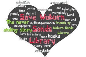 February 5, 2011 was Save Our Libraries Day in the United Kingdom. In Milborne Port in Somerset a hooded “book snatcher” stole books from children, and protesters in Sheffield held a shhh-in. There was a flashmob read-aloud in Cambridge, and we hear one supporter of libraries spent the day “joyreading.” This image is a “logo” for the Woburn Sands library — I love how it’s a sort of anti-logo, NOT the usual simple, simplified, simplistic, bombastic, corporate logo. Thanks, Dina Wood!