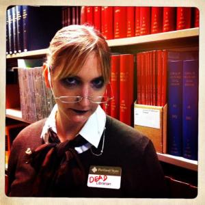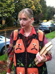 Two excellent Halloween costumes by my old friend Joan Petit. We went to high school together and then, lo and behold, we ended up in library school together! Not on purpose! Now she’s a librarian at Portland State University. No, she doesn’t normally wear the sad pumpkin vest. I’m guessing she won any and all costume competitions at her library this year.