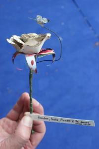 The mysterious book sculptor has struck again! So far, only a few of the fifty flowers she made have been found in Charlotte Square in Edinburgh. Each has a tag bearing a fragment of the Oscar Wilde quote from De Profundis: “…freedom, books, flowers and the moon.” (The full quote is “With freedom, books, flowers and the moon, who could not be happy?”)