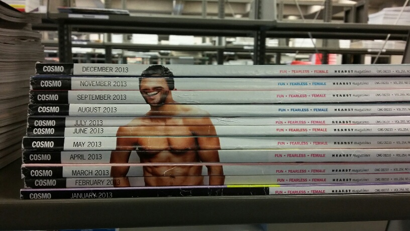 As you may or may not know, Cosmopolitan releases each year’s worth of issues so that if you stack them in order you’ll see a bare-chested man. The Colorado College stacks are usually missing an issue or two, which means that instead of a man, we get a monster. Thanks, Diane Westerfield!