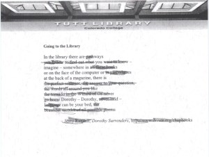 “Going to the Library,” was made into a promotional flyer for Tutt (where I work). Copies of this flyer hang in campus bathrooms. This morning a colleague found an amended version of the flyer in one of the library bathrooms. Someone turned my sweet little poem into a piece of smut!!